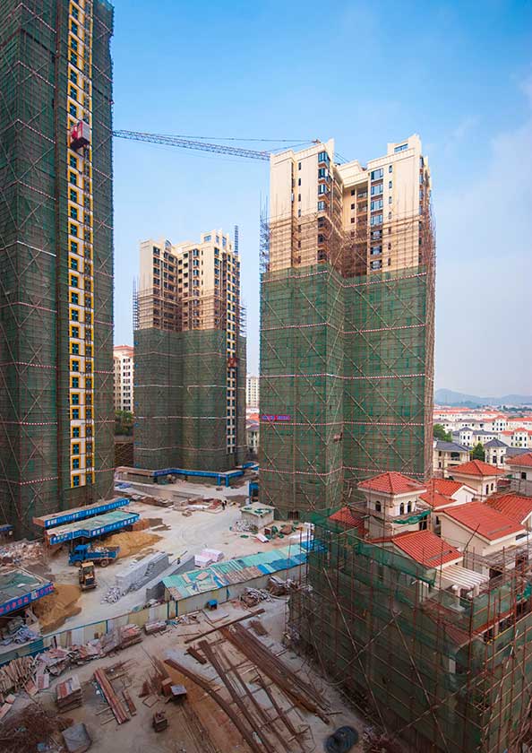3月26日,記者發現項目主入口處——豪華穹頂的腳手架已經拆除,給人以大氣、厚重之感,穹頂兩側的商鋪及人行道亦整飭一新。進入到施工現場,一幢幢洋房、別墅拔地而起。三正地產工程管理人員介紹,臥龍山一號洋房、別墅主體結構基本完工,大部分建筑已經進入內外墻抹灰及裝修階段。其中7#、8#幢洋房率先破繭——防護網已經拆除約1/3,露出色彩明快的立面。期待已久的業主,終于能夠一睹真容。一位參觀樣板房的置業者表示:洋房外觀比想象中的更加漂亮。