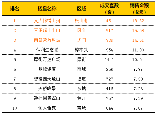 2014年,這些外地“大鱷”房企勢頭相當(dāng)猛,前10熱銷樓盤中,萬科、萬達(dá)、保利、碧桂園和恒大等占據(jù)半壁江山。據(jù)東莞中原提供數(shù)據(jù)顯示,今年光大錦 繡山河單盤吸金18.32億元排名全市第一,三正瑞士半山以15.58億元排名第二,南部灣萬科城項(xiàng)目以14.51億元緊追其后,排名第三。